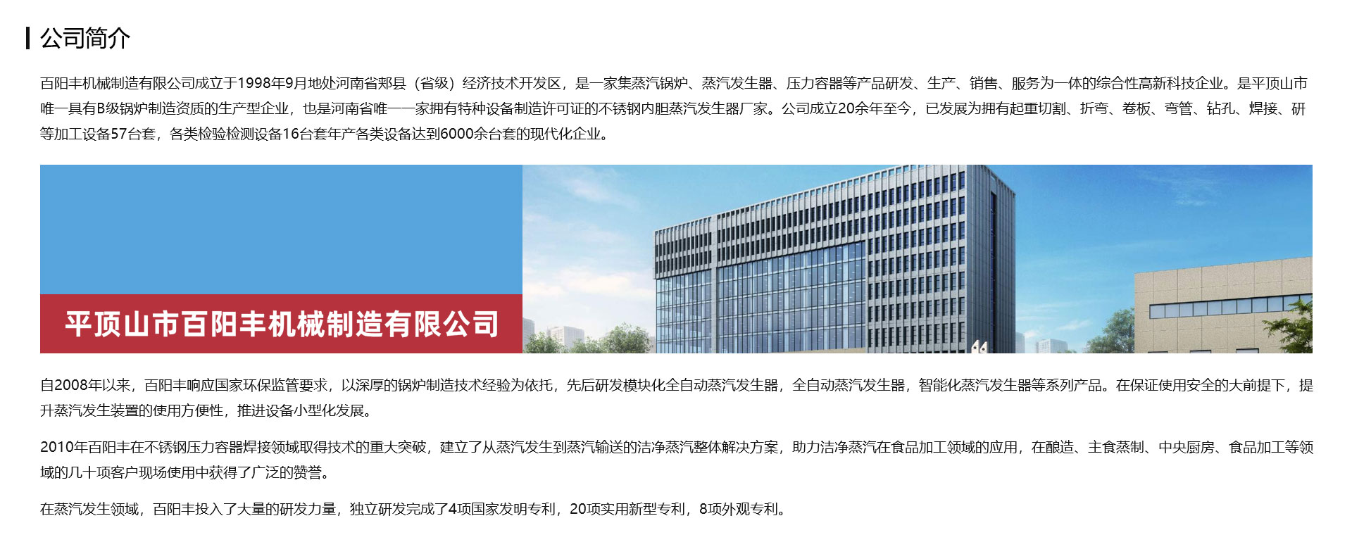 百陽(yáng)豐機(jī)械制造有限公司成立于1998年9月地處河南省郟縣(省級(jí))經(jīng)濟(jì)技術(shù)開發(fā)區(qū),是一家集蒸汽鍋爐、蒸汽發(fā)生器、壓力容器等產(chǎn)品研發(fā)、生產(chǎn)、銷售、服務(wù)為一體的綜合性高新科技企業(yè)。是平頂山市一家具有B級(jí)鍋爐制造資質(zhì)的生產(chǎn)型企業(yè),也是一家擁有特種設(shè)備制造許可證的不銹鋼內(nèi)膽蒸汽發(fā)生器廠家。公司成立20余年至今,已發(fā)展為擁有起重切割、折彎、卷板、彎管、鉆孔、焊接、研等加工設(shè)備57臺(tái)套,各類檢驗(yàn)檢測(cè)設(shè)備16臺(tái)套年產(chǎn)各類設(shè)備達(dá)到6000余臺(tái)套的現(xiàn)代化企業(yè)。